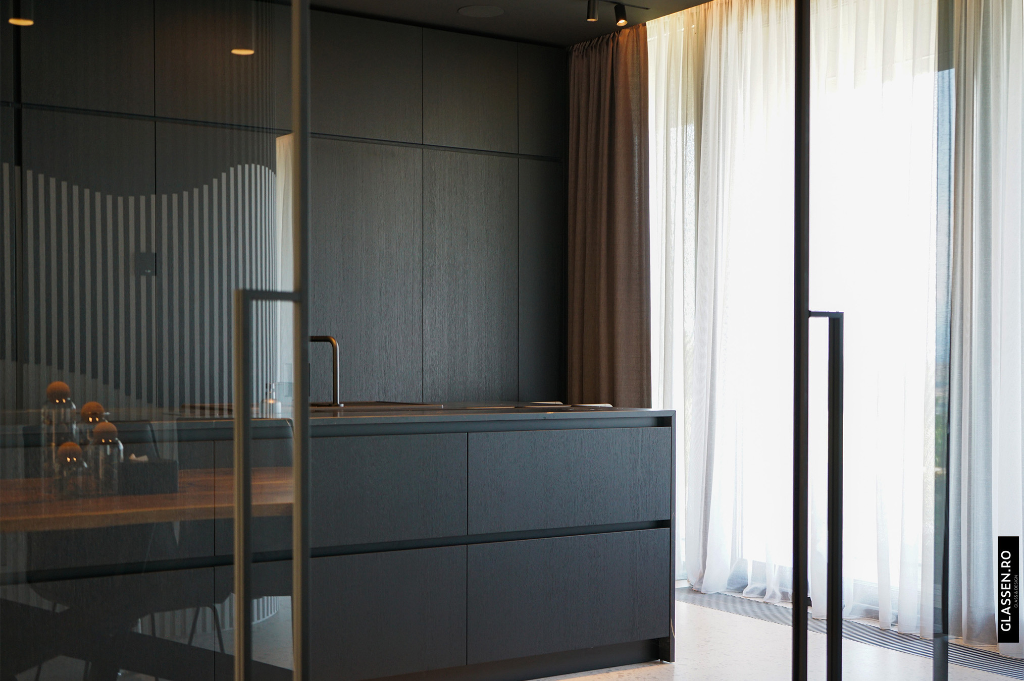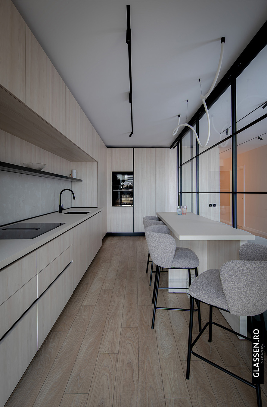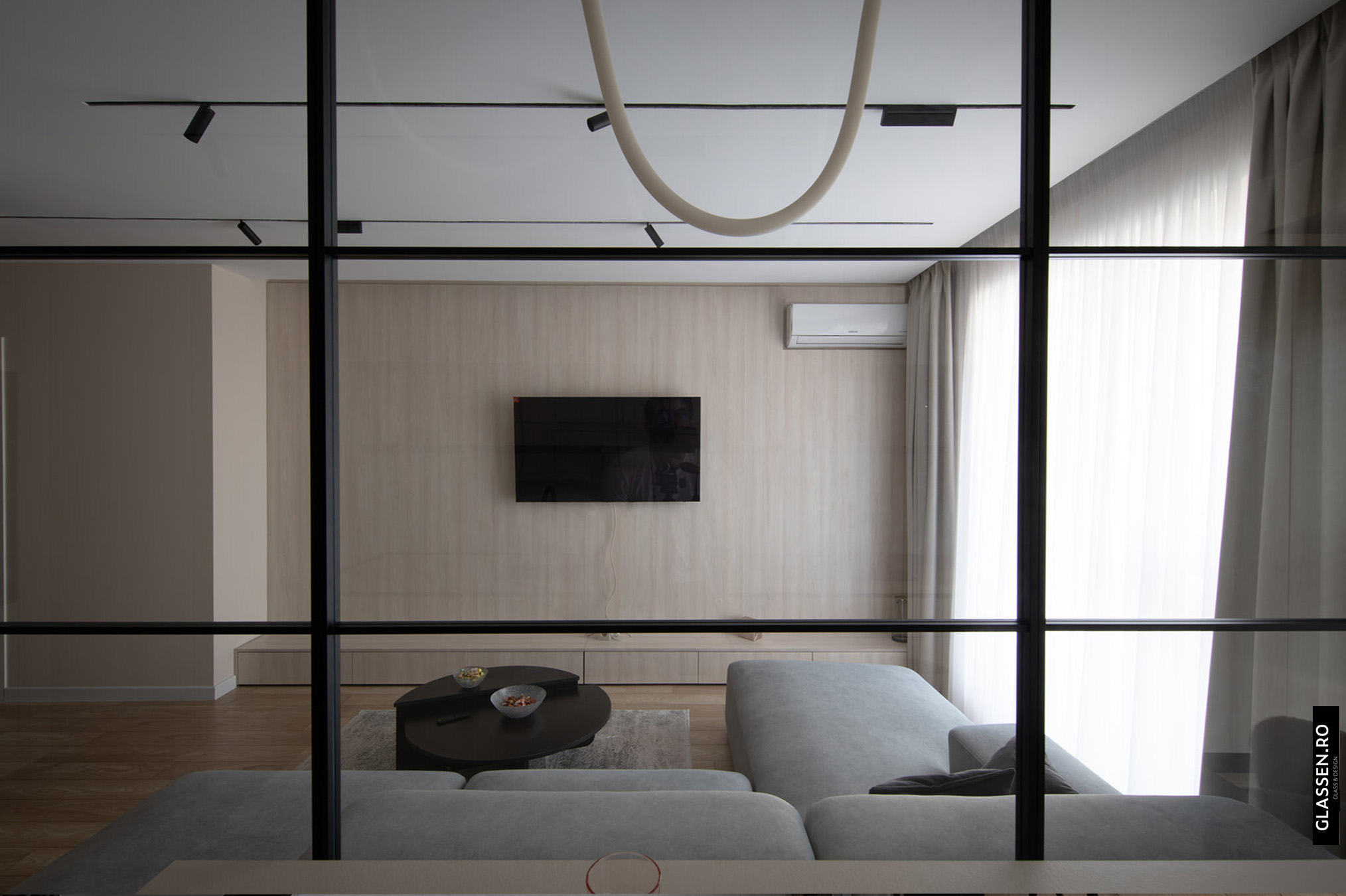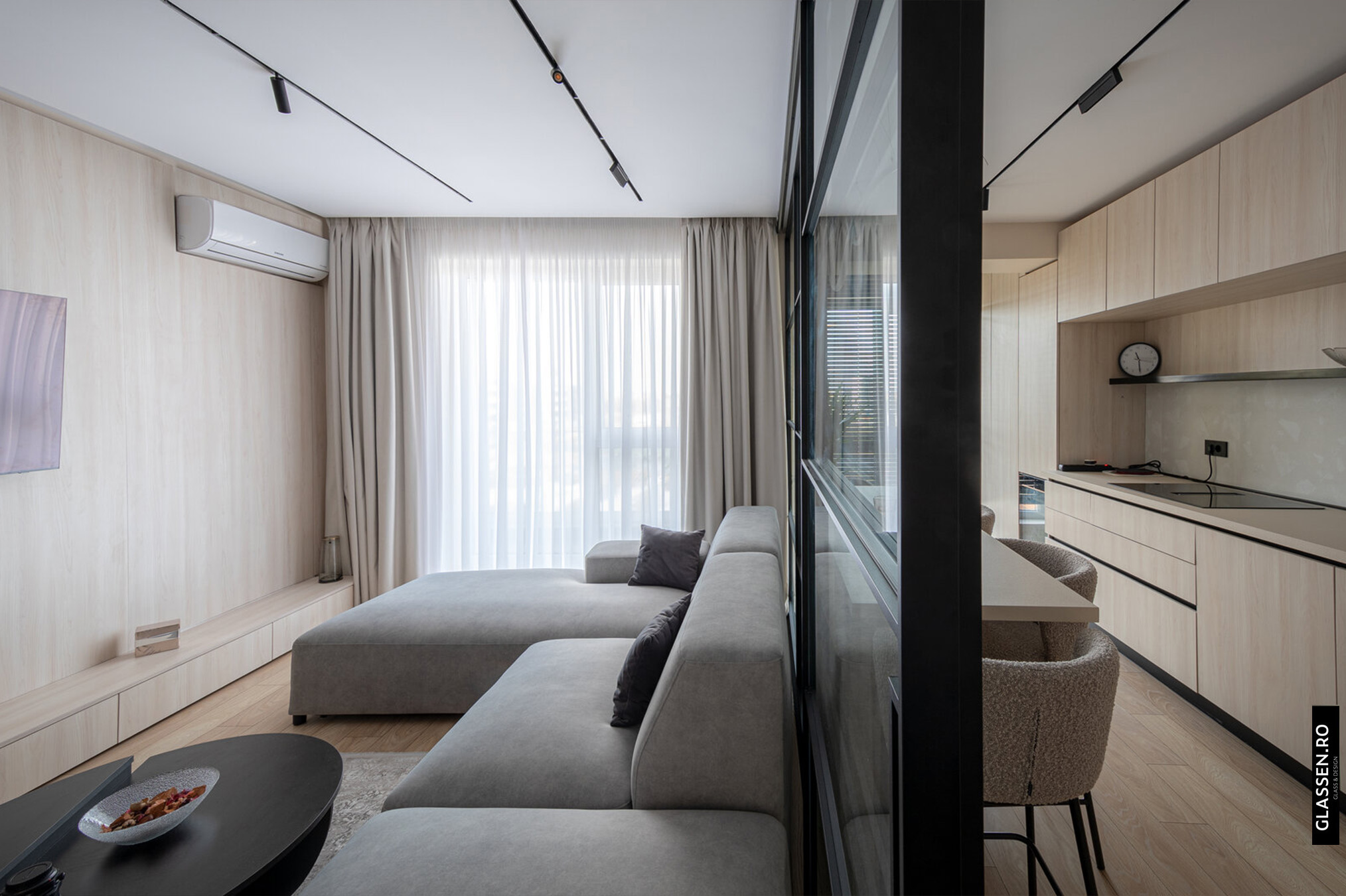 "Un prim pas în amenajarea acestui apartament a reprezentat necesitatea unui vestibul în zona de acces, pentru a proteja și separa zona de zi, dar și pentru a obține un spațiu de depozitare, iar între bucătărie și living, am inserat un perete din sticlă ce separă cele două zone din punct de vedere funcțional, fără a compromite senzația de spațiu deschis. Această soluție permite pătrunderea luminii naturale în ambele camere, păstrând o continuitate vizuală între cele două zone, fără să afecteze percepția asupra spațiului interior."