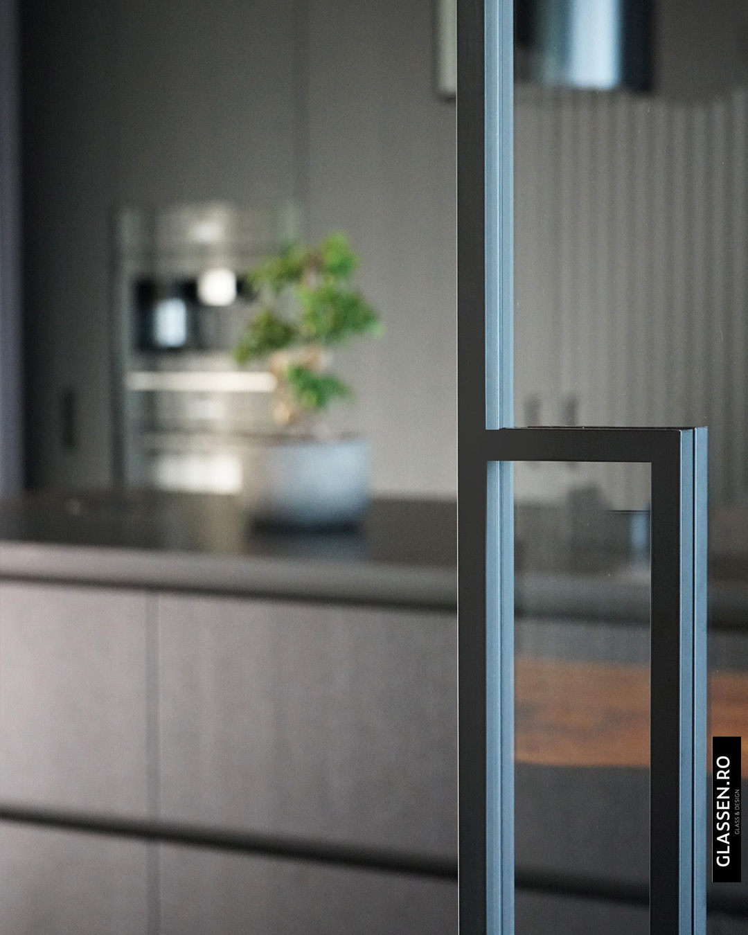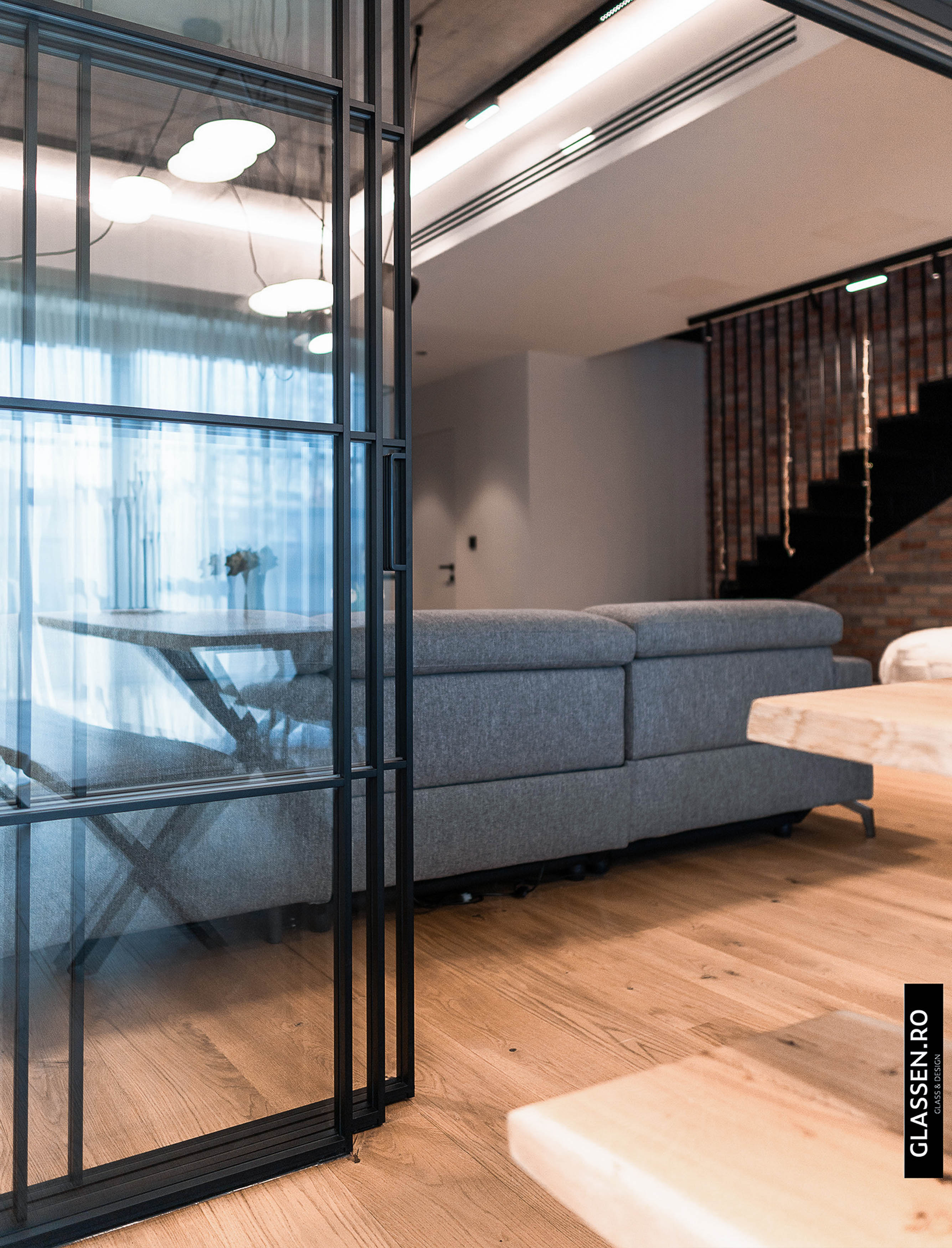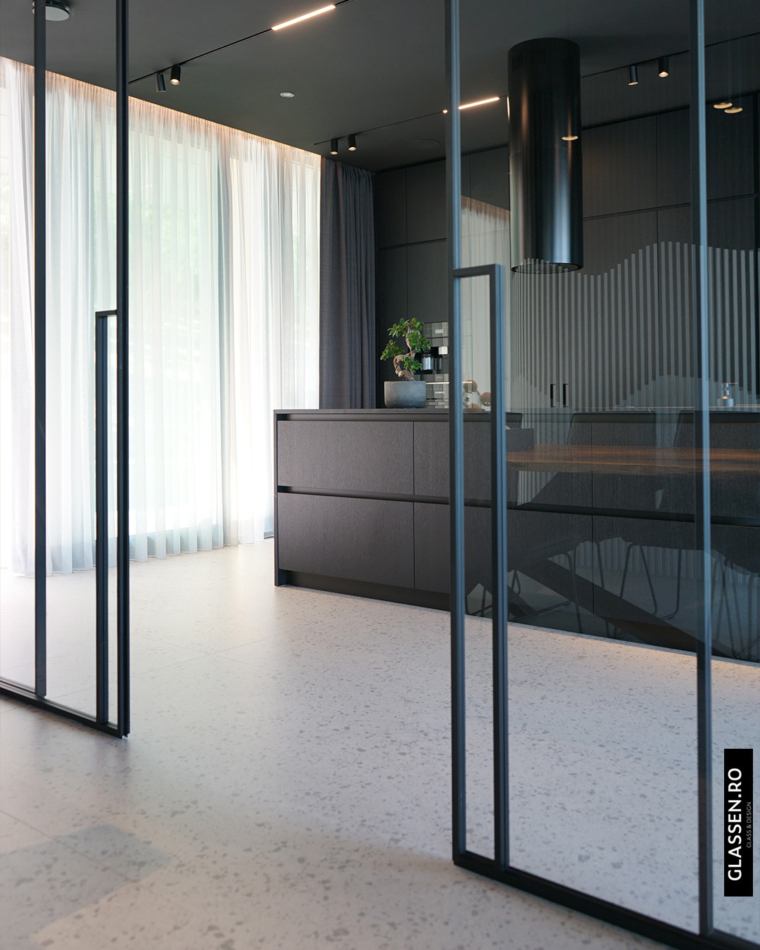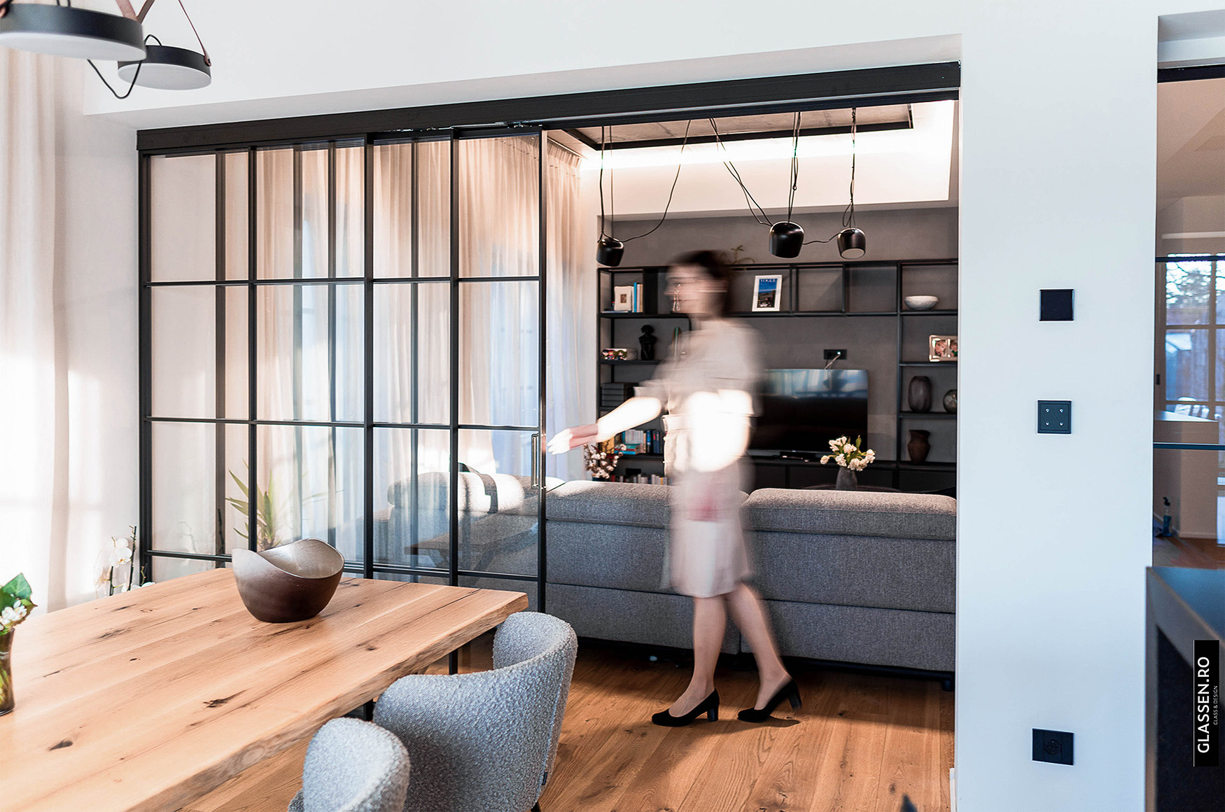 "Un prim pas în amenajarea acestui apartament a reprezentat necesitatea unui vestibul în zona de acces, pentru a proteja și separa zona de zi, dar și pentru a obține un spațiu de depozitare, iar între bucătărie și living, am inserat un perete din sticlă ce separă cele două zone din punct de vedere funcțional, fără a compromite senzația de spațiu deschis. Această soluție permite pătrunderea luminii naturale în ambele camere, păstrând o continuitate vizuală între cele două zone, fără să afecteze percepția asupra spațiului interior."