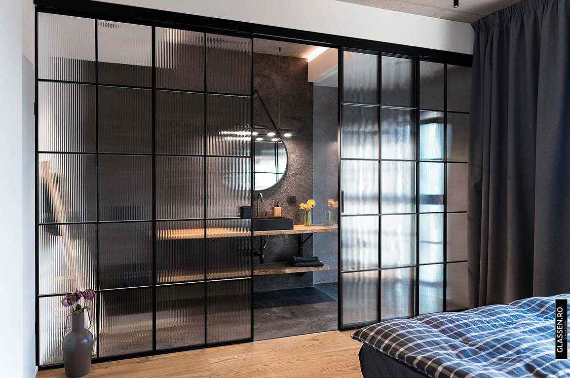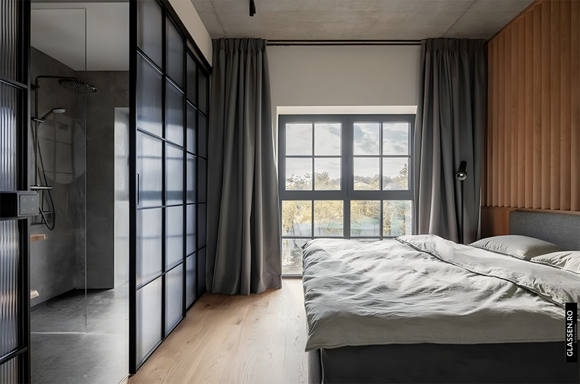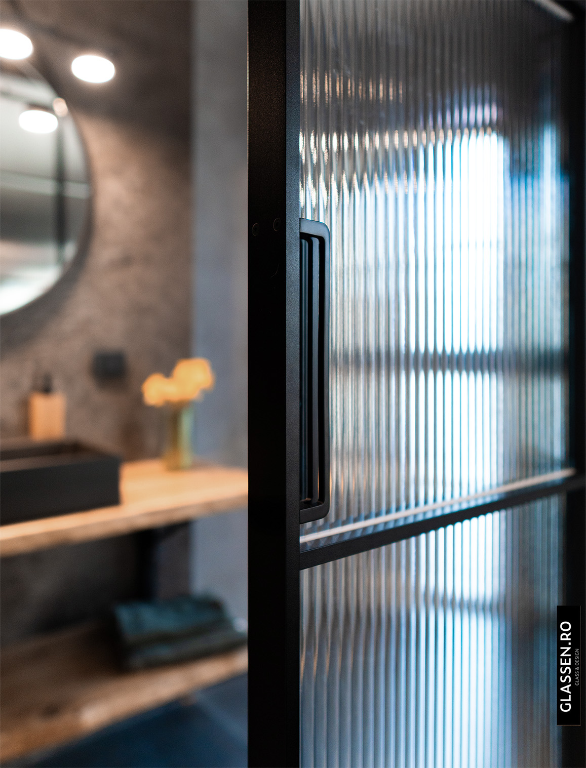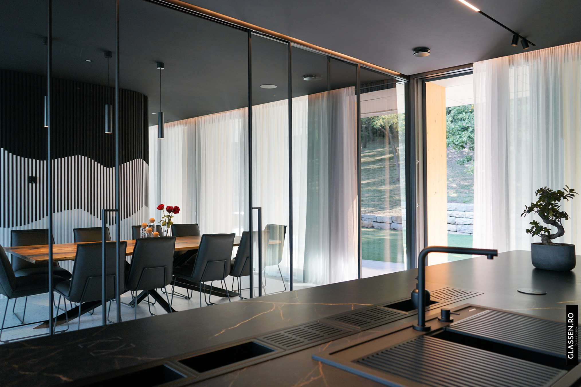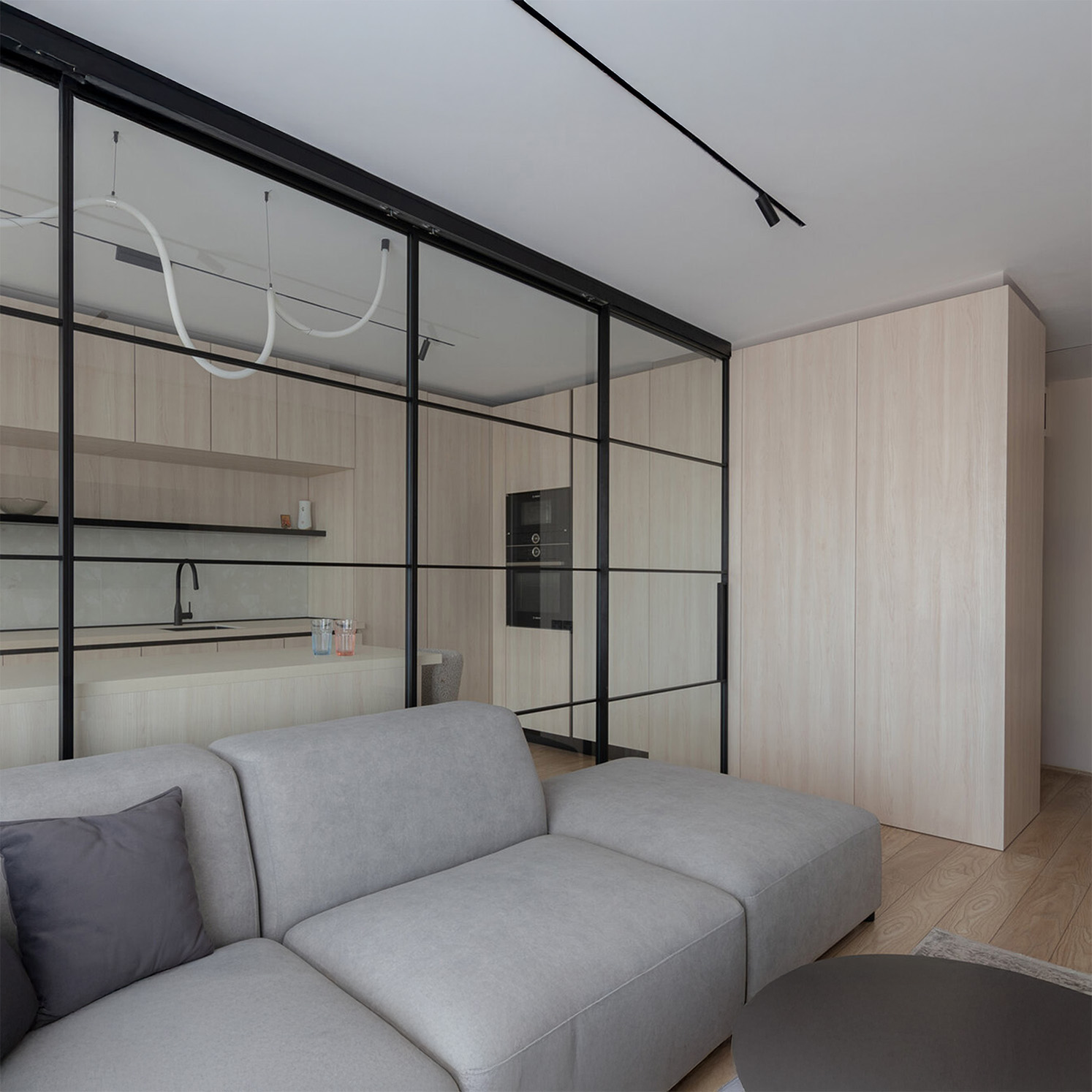 "Un prim pas în amenajarea acestui apartament a reprezentat necesitatea unui vestibul în zona de acces, pentru a proteja și separa zona de zi, dar și pentru a obține un spațiu de depozitare, iar între bucătărie și living, am inserat un perete din sticlă ce separă cele două zone din punct de vedere funcțional, fără a compromite senzația de spațiu deschis. Această soluție permite pătrunderea luminii naturale în ambele camere, păstrând o continuitate vizuală între cele două zone, fără să afecteze percepția asupra spațiului interior."
