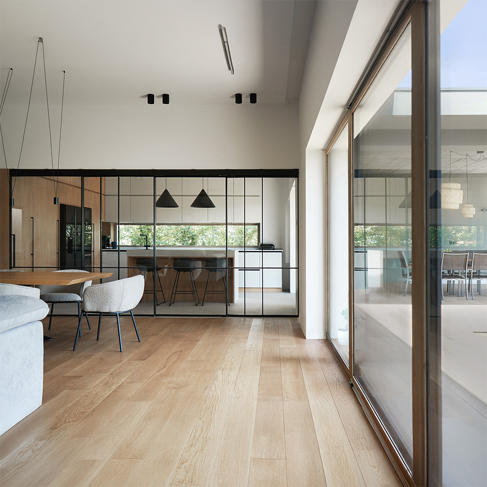 La interior, fiecare metru pătrat este folosit cu înțelepciune pentru a crea un spațiu care se adaptează nevoilor locuitorilor săi. Compartimentarea interioară inteligentă optimizează fluxul de lumină naturală și spațiul, creând o atmosferă primitoare și aerisită pusa in valoare de @samibumbustudio pentru fiecare colț al casei.