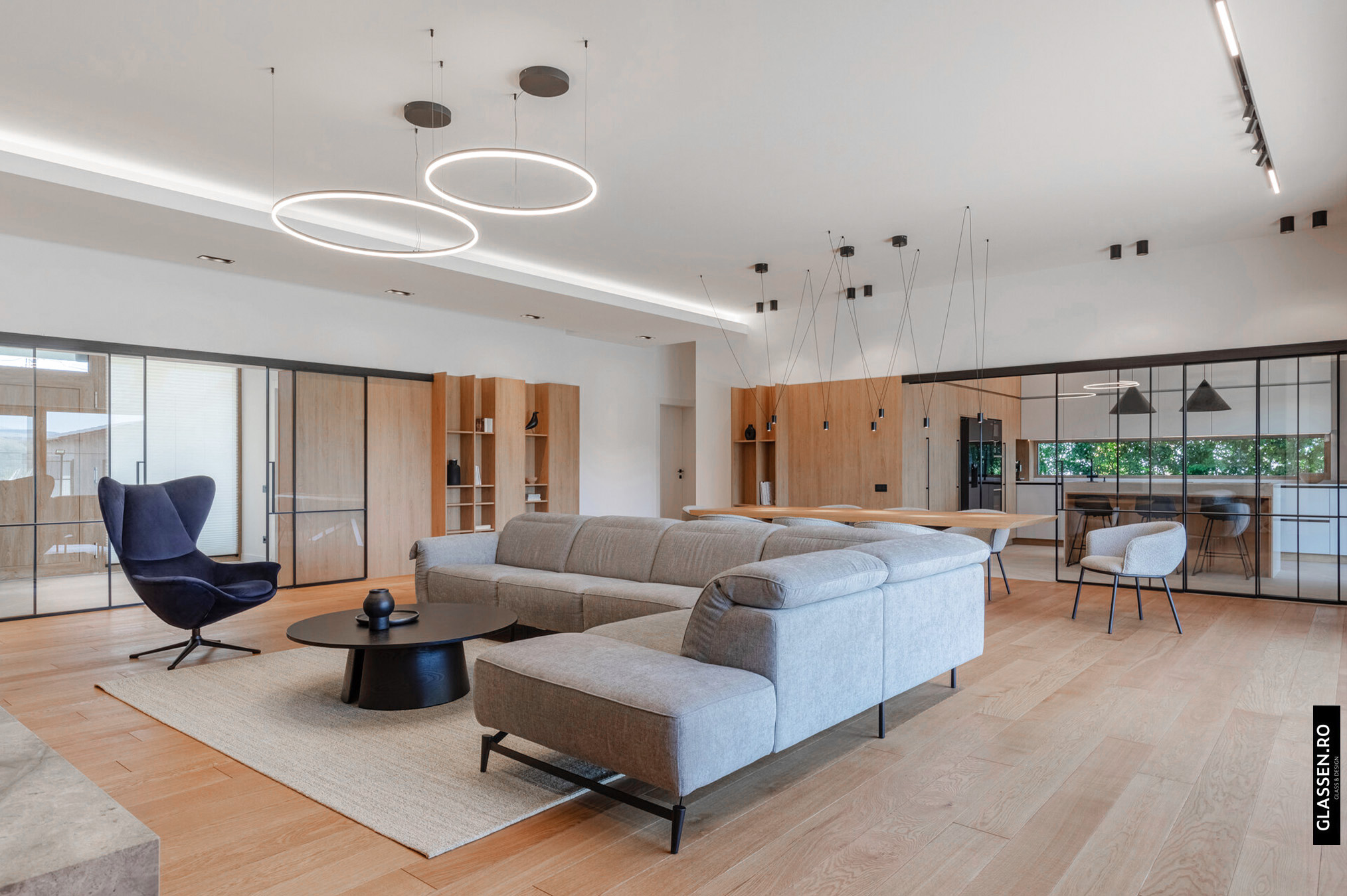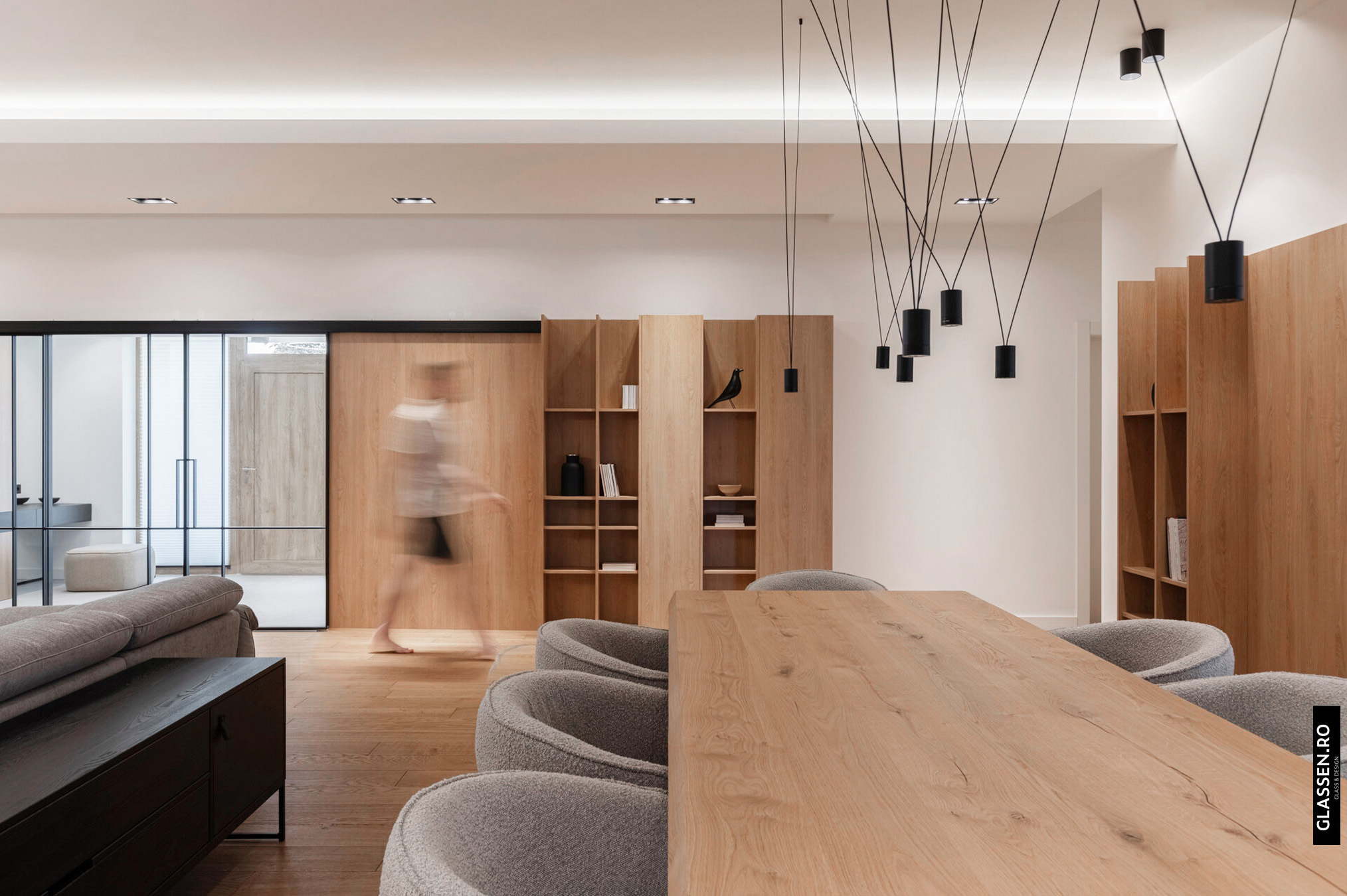 Soluția de compartimentare a spațiului este întotdeauna apreciată de colaboratorii noștri. "Provocarea proiectului a fost de a echilibra suprafața mare deschisă a zonei de zi (un open-space de aproape 100 mp), „zonificând” spațiile și proporționând piesele de mobilier astfel încât spațiul rezultat să fie intim, dar neaglomerat de lucruri inutile "- arh. Radu Postolache